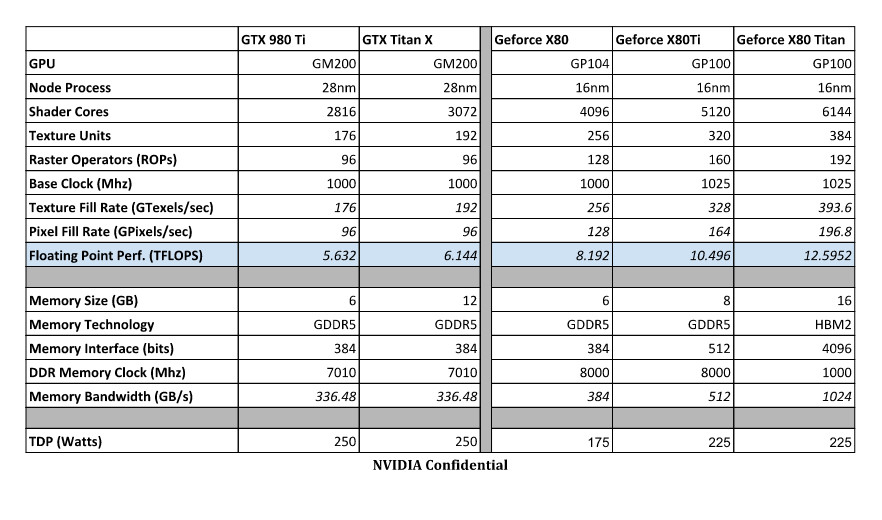 A "GP100" 6144 CUDA maggal (384 textúrázó, 192 ROP egység) rendelkezik majd. A Geforce X80Ti ebből csak 5120 CUDA magot (320 TMU, 160 ROP) használhat majd, 512 bites memória vezérlő és 8 GB GDDR5X memória lesz rá jellemző 512 GB/s memória sávszélesség mellett. A Geforce X80 TITAN megkapja mind a 6144 CUDA magot és 16 GB HBM2 memória 4096 bites interfészen kommunikálnak majd a grafikus maggal 1 TB/s memória sávszélességet produkálva.