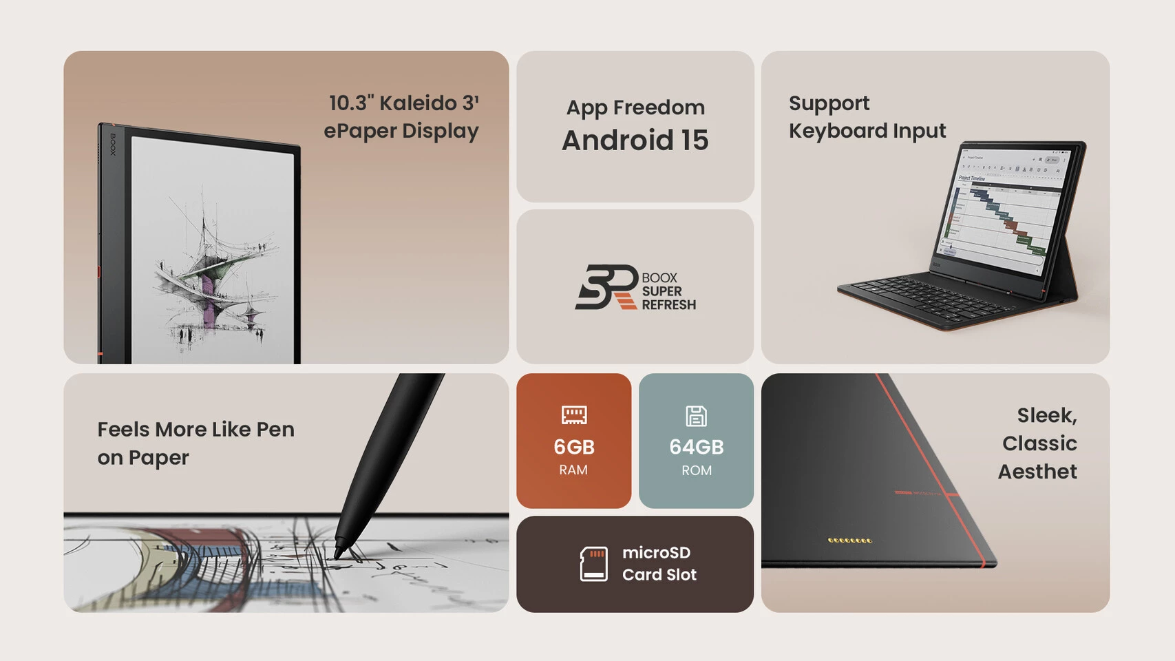 Elegáns külseje alatt a Note Air5 C egy nyolcmagos CPU-val, 6 GB RAM-mal és 64 GB-os tárhellyel rendelkezik, így gyors és reszponzív multitaskingot biztosít. A BOOX Super Refresh technológiával zökkenőmentes görgetési-, kézírási- és alkalmazásváltási élményben lehet részed, így a lendületed soha nem szakad meg. Android 15-öt használ előtelepített Google Play Áruházzal, így szabadon testreszabhatod munkaterületed és letöltheted az összes alapvető alkalmazást, legyen szó olvasásról, jegyzetkészítésről, napirendtervezésről, dokumentumok menedzseléséről vagy kedvenc produktivitási eszközeid használatáról.