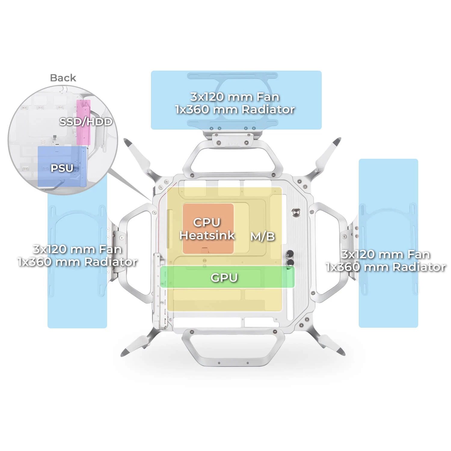 Az open-frame kialakításnak köszönhetően szinte korlátlan a levegőáramlás lehetősége: akár 9 darab 120 mm-es ventilátor, vagy három 360 mm-es radiátor is elhelyezhető benne. A házban beépített kábelrendező kampók és moduláris tartók gondoskodnak arról, hogy az általában nyitott konstrukció ne váljon „kábelrengeteggé”. A gépház 450 euró körüli áron lesz megvásárolható.
