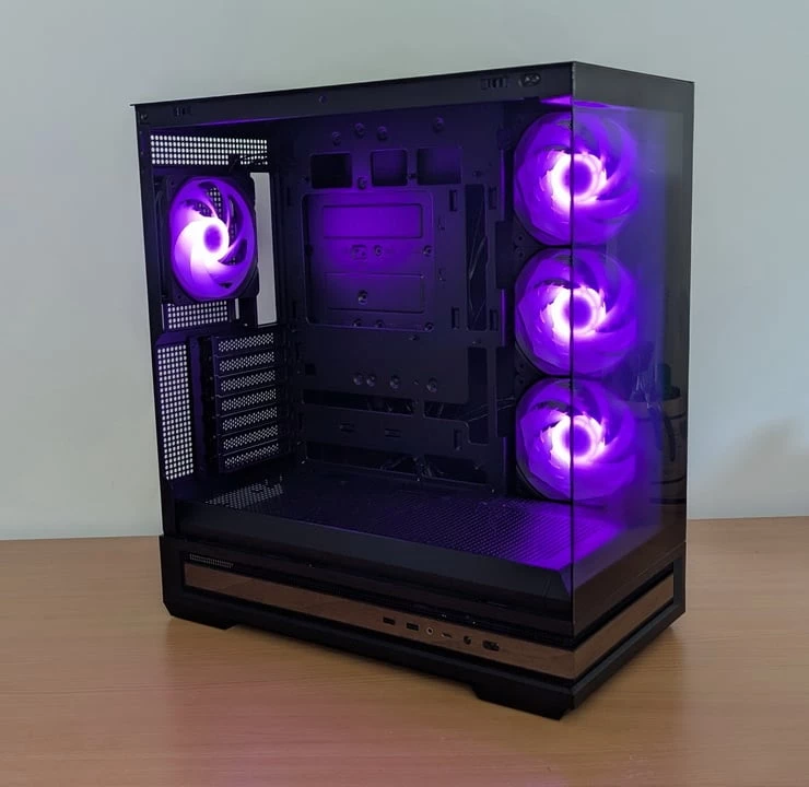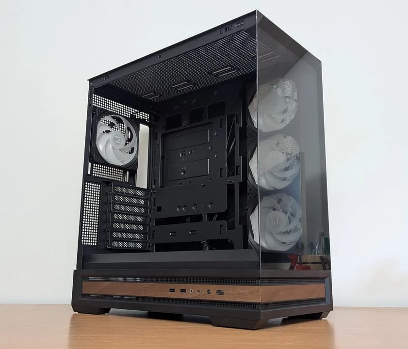 A Zalman P40 Namu összeszerelése során egyértelműen érződik, hogy átgondolt konstrukcióval van dolgunk. Nem a legextrémebb, legmodulárisabb ház, de minden alapvető igényt magabiztosan teljesít: jól szellőzik, halk, elég helyet ad a kábeleknek és a nagyobb komponenseknek, és még egy kis dizájnt is csempész a buildbe a fa betétekkel. A perforált oldallap jól működik a légáramlásban, a ventilátorok alapból is jó légmozgást biztosítanak.