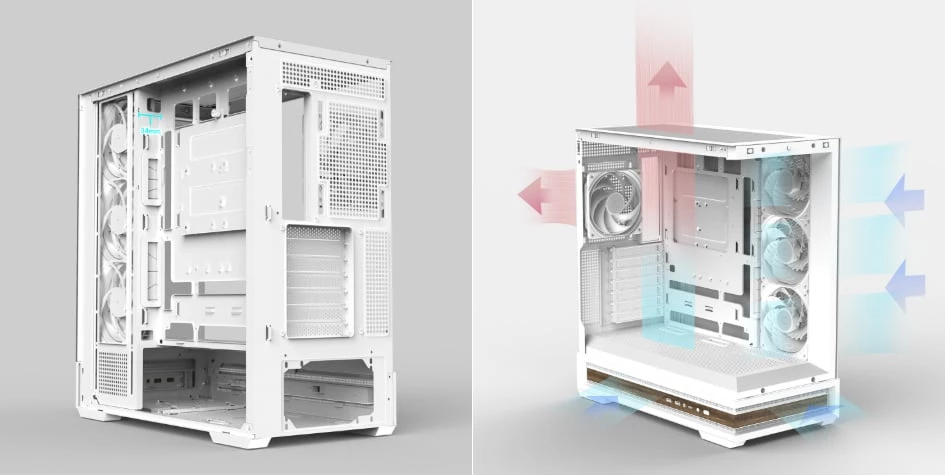 A ház ATX, mATX és mini-ITX alaplapokat támogat, valamint bőséges helyet kínál nagy méretű léghűtőknek és akár 360 mm-es radiátoroknak is — ez különösen fontos azoknak, akik AIO-val vagy komoly vízhűtéses rendszerrel építenének.